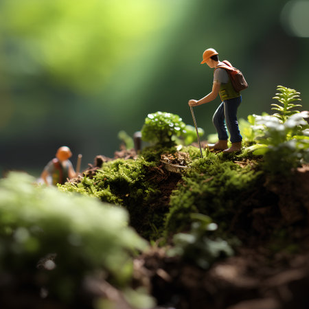 Miniature figures of hikers trekking through a lush mossy landscape with sunlight filtering through.