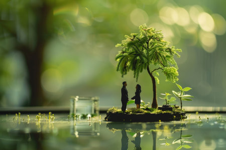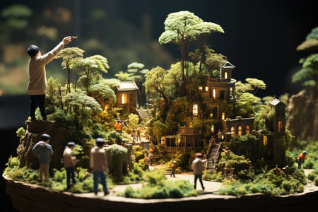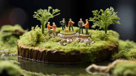 Miniature Scenery of miniature people maintain, minimalist, intricate details, green concept.