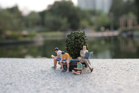 Tiny figures sit on a bench, engaged in reading, surrounded by greenery