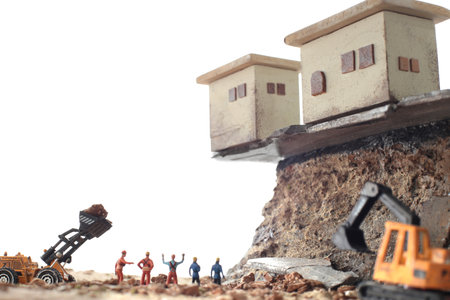 Plastic toy figures of construction workers with construction equipment at a construction site