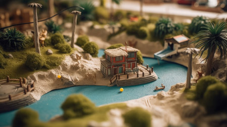 Colorful miniature village by the water with intricate houses and scenic landscape during the golden hour