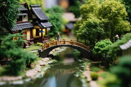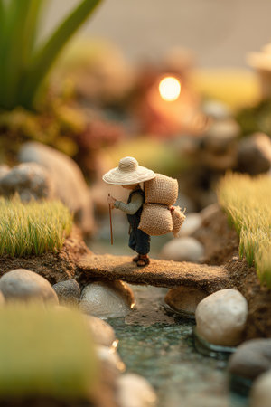 A miniature figure walks across a tiny bridge, carrying large sacks. The figure wears a hat under the warm glow of the setting sun. The scene features lush miniature plants, rocks, and flowing water, creating a tranquil environment. This image could be used for storytelling, illustrations, or conceptual designs.