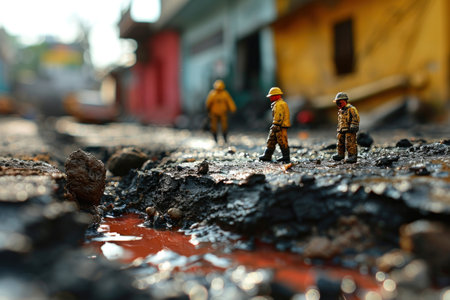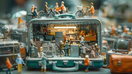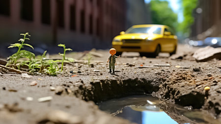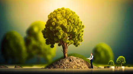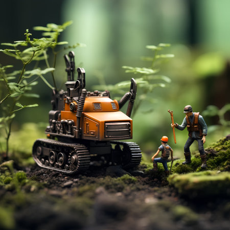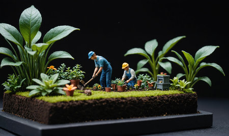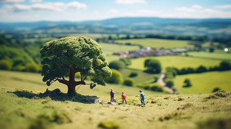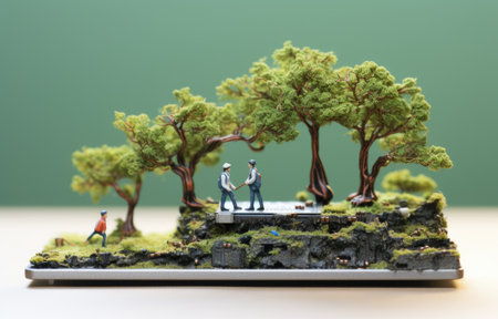 Miniature Scenery of miniature people maintain, minimalist, intricate details, green concept.