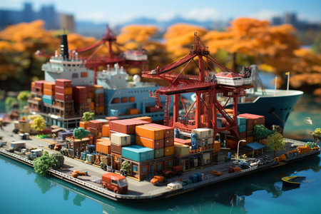 world of shipping transports. Depict a bustling port with cargo ships of various sizes and types, loading and unloading goods by cranes.Generated with AI