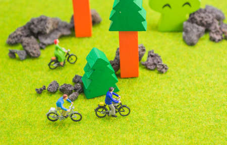 image group of people(mini figure dolls) with retro bicycle in a park.