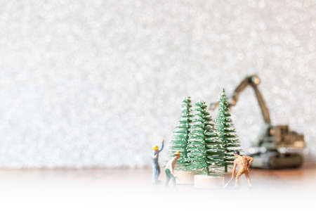 Miniature people : walking on the snow in winter season. Image use for Christmas and new year concept.