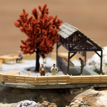 Selective Focus of Miniature, tourists walking on mountain top observation deck and enjoying nature landscapes. Tourism and traveling concept. Macro photo, shallow DOF