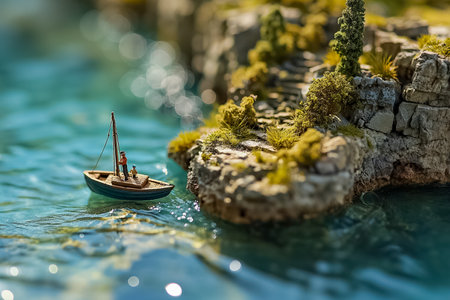 Miniature model of a fishing boat next to a rocky outcrop, depicting a tranquil maritime scene