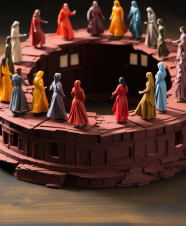 A group of six miniature figures is gathered around a large pile of various materials, each engaged in sorting and organizing. The playful scene showcases teamwork and cooperation.