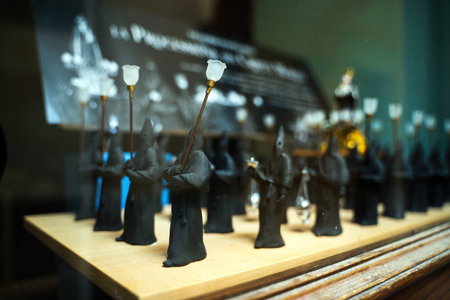 BOLOGNA, ITALY - FEBRUARY 18, 2019: lights are enlightening statues at stand in DEVOTIO Religious products and service exhibition