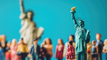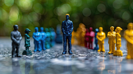 Miniature human figure figurine male female doll row line border copy text sign space on blue paper background