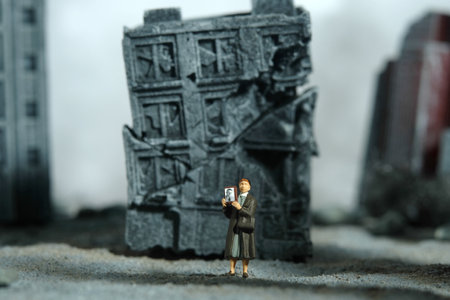 Miniature people toy figure photography. A woman holding photo frame, searching for missing person because of war conflict in the middle of ruined demolish city. Image photo