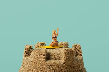 closeup of a miniature woman in swimsuit, kneeling on a surfboard, on the top of a sandcastle, against a blue background with a large blank space on top