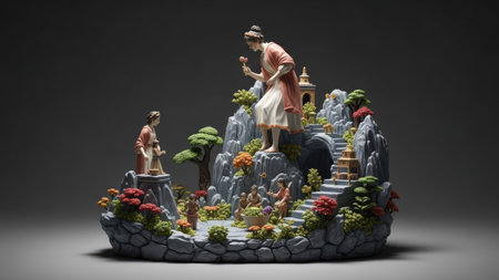 Tiny figures sit on a bench, engaged in reading, surrounded by greenery