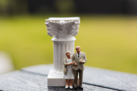 A miniature elderly couple pose near a decorative white column outdoors Old people - retired man and a woman - stands by a decorative column, with a soft, blurred green background. Retirement planning