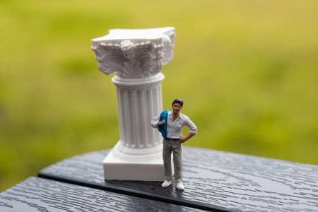 A confident miniature man posing next to an ornate white column outdoors. A figurine of a businessman stands confidently beside a column. The scene is set against a blurred, verdant background.