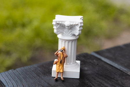Miniature photographer captures a picture while travels. An old woman figure photographing standing by a classical white pillar, column outdoors. An aging person traveling, taking pictures on a camera
