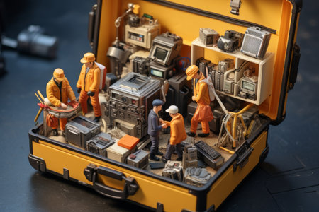 Miniature figures of workers against yellow backdrop