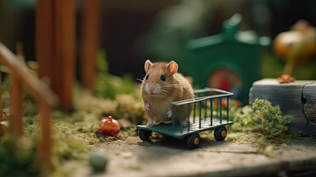 A squirrel or chipmunk standing in front of a construction vehicle. AI generative image.