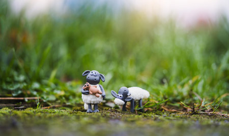 cute sheeps toy standing in green grass after rain, Two Little lamb toy with blurry bokeh natural green meadow.