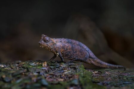 Brown leaf chameleon - Brookesia superciliaris, small beautiful endemic chameleon from Madagascar tropical forest, Camouflage.