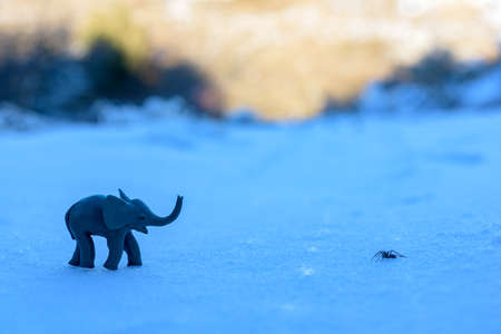 Brown bear walking in forest. Mini bear figure (or toy bear) at the park. Selective focus