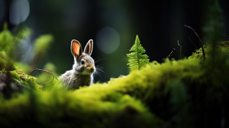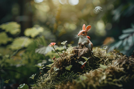 Toy rabbit is perched atop a moss covered stump, enjoying the tranquility of a vibrant forest scene