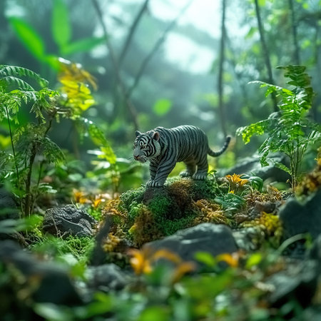 diorama of a Sumatran tiger statue in a traditional Indonesian forest setting, dense greenery, moss-covered rocks, soft diffused light filtering through the trees, photorealistic, cultural item --chaos 10 --ar 1:1 --v 6.1 Job ID: a11bc4f6-6819-4d92-be5a-23c142db5ff9