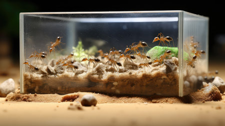 A colony of ants actively navigates through their formicarium, where vibrant moss and rocky structures create an engaging ecosystem, illuminated softly to highlight their activities.