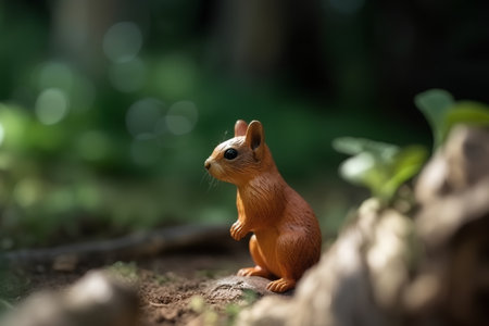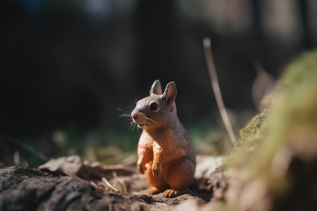 Squirrel sitting on the ground in the forest. Shallow depth of field.