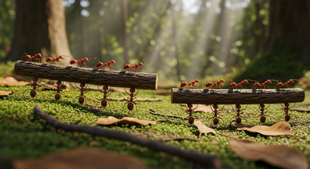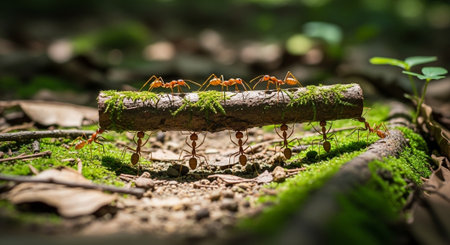 A mesmerizing display of teamwork unfolds in the miniature world of ants A group of tiny creatures, united in purpose, collaborate to carry leaves, their minuscule bodies dwarfed by the branches they navigate Their synchronized movements and unwavering dedication to the collective good offer a compelling testament to the power AI Generative