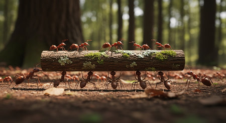 Close-up of ants marching on a moss-covered log, surrounded by vibrant autumn foliage and illuminated by warm sunlight in a serene forest.