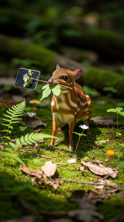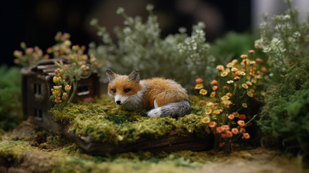 a toy deer stands gracefully amidst a lush forest, captured in the style of meticulous photorealistic still lifes. this artwork showcases delicately rendered landscapes, shot on 70mm film, with a color palette of light brown and yellow. the result is a stunning blend of realistic fantasy artwork, reminiscent of portrait miniatures, and dreamy, blurred landscapes. ai generated