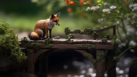 Red fox sitting on a wooden bridge in the garden. Selective focus.