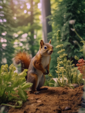 a squirrel sitting on a tree trunk in a forest looking at the camera. . generative ai