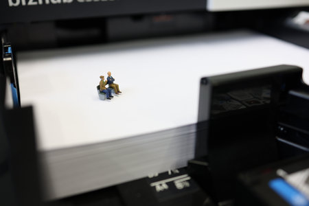 Miniature people: Businessman sitting on the printer. Selective focus.
