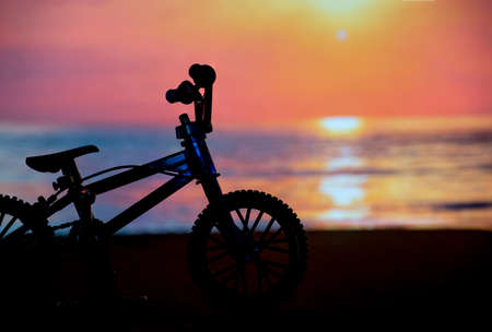 The silhouette photo of bicycle on the beach with sunset twilight hour background