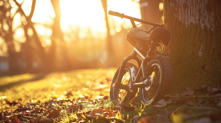 End of Adventure - Tranquil Sunset Scene with Balance Bike and Childs Jacket Resting by Tree Trunk
