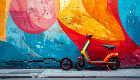 An electric scooter is parked on a city sidewalk, set against a dynamic and colorful graffiti mural.