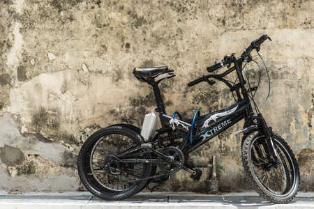 Singapore-17 OCT 2017: old rusty bike park beside grey wall