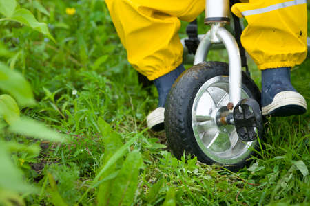 Closeup of toddler child feet in rubber boots and pants riding a bicycle on green grass. Boy walking outdoors after the rain.