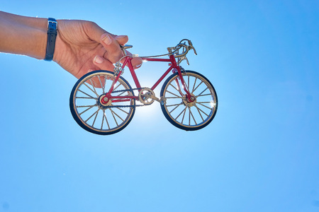 red metal toy bike in the hands on the background of a clear sky and the sun on a clear sunny day in the summer while traveling
