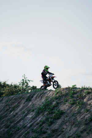 Kiev, Ukraine - July 16, 2017: Kid on motorcycle going thru dirt, during Championship of Ukraine on cross-country final stage.