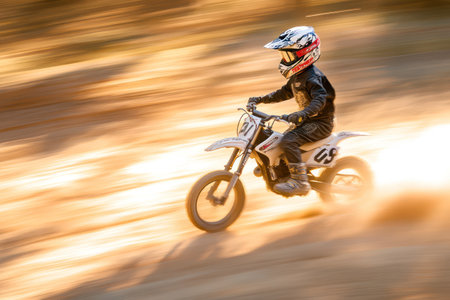 Young dirtbike rider in motion, kicking up dust on a sandy trail-showing adventure, courage, and off-road energy.