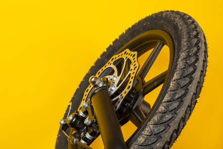 Yellow bicycle on wall background