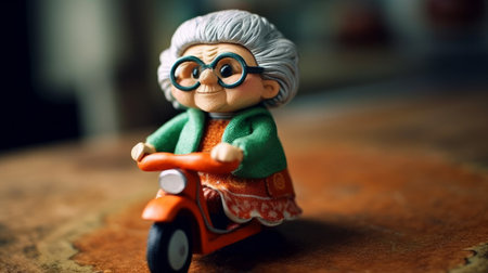this doll is dressed in a green, blue, and white dress with an orange sweater. she wears tiny glasses made of metal wire and resembles a beautiful grandmother. ai generated