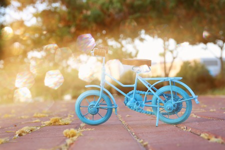 Blue vintage bicycle toy waiting outdoors at sunset light