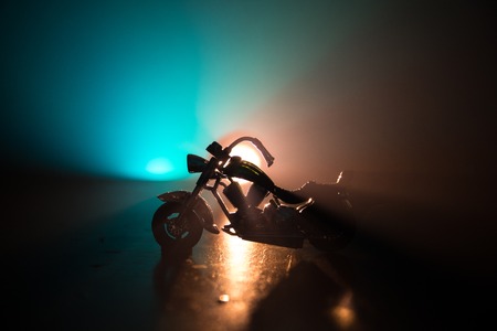 High power motorcycle chopper. Fog with backlights on background with man rider at night. Empty space. Selective focus