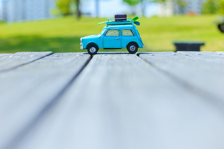 Toy car of blue color in the back of a cabriolet on wooden boards on white