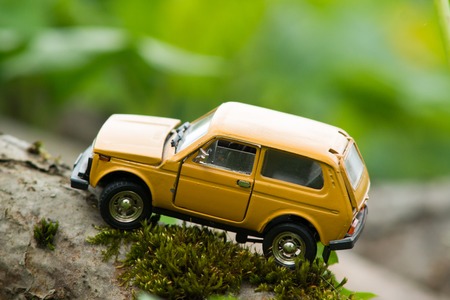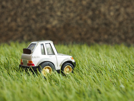 Miniature SUV car on a fence. Macro photography.